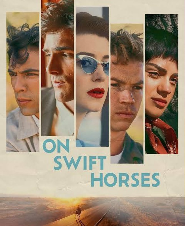 "On Swift Horses" is a 2024 romantic drama set in 1950s America, exploring two parallel queer love stories. As Muriel navigates a quiet life with hidden desires, her brother-in-law Julius embarks on a secret romance with another man, Henry, in Las Vegas. The film highlights LGBTQ+ identities through themes of forbidden love, repression, and longing in a postwar era.